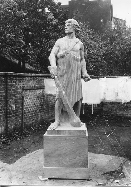 'Um Spenden für die Errichtung eines Kriegswahrzeichens zu erlangen, wandte sich ein aus der Stammtischgesellschaft 'Großes Hauptquartier' bei Beiderlinden hervorgegangener Ausschuß unter der Führung des Rentners Bernard Wulff an die Mitbürger in Stadt und Land mit einem Aufrufe. Der Ausschuß plant die Errichtung einer Holzfigur, der Idealfigur eines kampfbereiten jungen Germanen, auf dem Prinzipalmarkt. Die Ergebnisse der Nagelung sollen den Hinterbliebenen der aus den Kreisen Münster Stadt und Land stammenden Kriegsteilnehmer zugute kommen.'
