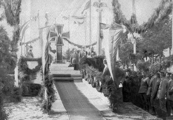 'Während das Kriegswahrzeichen der Stadt Münster und des Landkreises Münster fertiggestellt wird, ist von dem Landsturm-Infanterie-Ersatzbataillon Nr. 7 auf Haus Spital ein eigenes Wahrzeichen errichtet. In Anlehnung an die alten schönen Wegekreuze des Münsterlandes hat das Bataillon aus freiwiligen Gaben ein Eisernes Kreuz aus eichenen Balken herstellen lassen, dessen Flächen Platz für 12.000 Nägel bieten. Inmitten einer hochgezogenen Anlage von 9 Meter im Geviert, die mit einer lebenden Taxushecke eingefriedigt ist, wurde das Eiserne Kreuz an der Horstmarer Landstraße, dort wo der Weg zum Haus Spital abbiegt, aufgestellt. Am heutigen Sonntagvormittag fand die feierliche Enthüllung des Denkmales statt.'