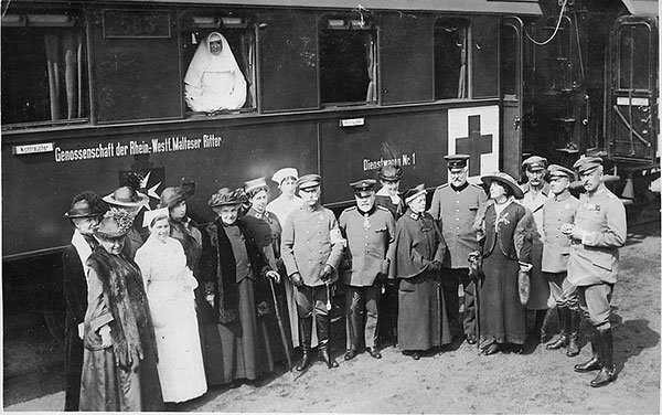 'Der Malteser-Lazarettzug S II, welcher Verwundete hierher und nach Osnabrück gebracht hatte, wurde auf dem Bahngleise bei der städtischen Gasanstalt von zahlreichen Personen besichtigt.'