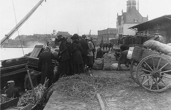 'Die gesteigerte Lebensmittelzufuhr für die zahlreichen Truppen der hiesigen Garnison, für die Proviantläger der Heeresverwaltung und für die bürgerliche Bevölkerung macht auch eine stärkere Benutzung unserer Hafenanlagen bemerkbar. Das große städtische Hafenbecken ist zur Zeit mit 35 Schiffen belegt, der höchsten seit der Hafeneröffnung 1898 erreichten Zahl.'