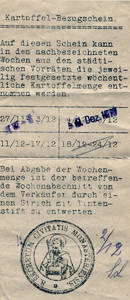 Anfang März 1915 regelt der Magistrat der Stadt Münster die Brotversorgung neu. Über Berechtigungsscheine erhalten die Haushalte Brotmarken. Es werden vier verschieden große, aus Blech gestanzte, kreisförmige Brotmarken ausgegeben, die die Übegabe von 2.500, 1250, 250 oder 25 Gramm Brot oder einer unterschiedlichen Menge Mehl ermöglichen.