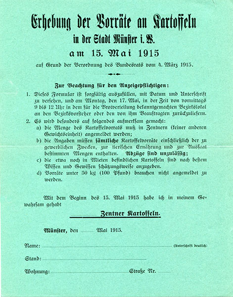 Schon im Januar 1915 beginnen Rationierungen von Lebensmitteln. Seit 8. März werden Ausweiskarten, die als Berechtigungsscheine für den Erhalt von Brotmarken gelten, und Haushaltungskarten ausgegeben, auf denen die Anzahl der im Haushalt lebenden Personen vermerkt waren. Die erste Ausgabe von Brotmarken erfolgt am 13. März 1915, die zwei Wochen gültig sind. Vom 8. bis 21. Oktober 1915 sind 88.397 Personen in Münster versorgungsberechtigt. Mehrere Volkszählungen und Personenbestandsaufnahmen dienen der Ermittlun der Zahl der Berechtigten.