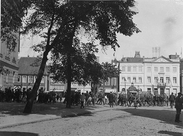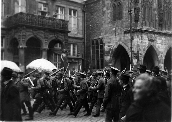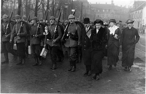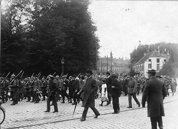 'In der Mittagsstunde marschierte mit Musik ein Landsturm-Regiment von der Bahn durch die Stadt; die meisten Leute hatten graue Bärte.'