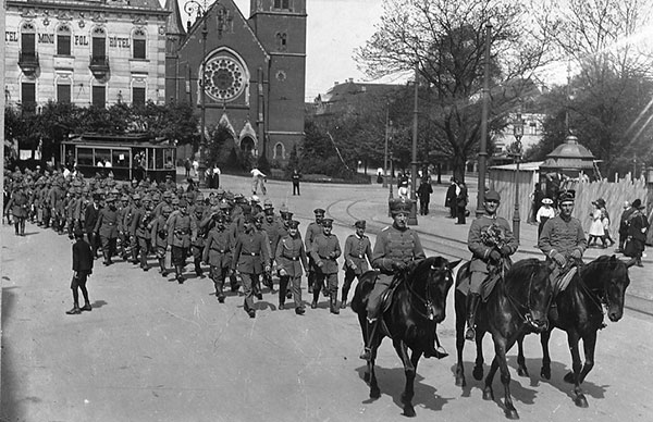 'Mit klingendem Spiele rückte am Vormittag von der Ägidiikaserne eine rund 200 Mann starke Ersatzabteilung der Dreizehner ins Feld, wohl nach Verdun, wo das Ringen noch immer dauert, ohne bis jetzt den von vielen Optimisten schon längst erwarteten Fall der starken Festung erzielt zu haben.'