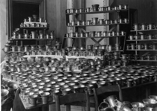 'Die städtische Metallsammelstelle für Kupfer, Messing und Reinnickel wurde geschlossen. Für die Rohstoffversorgung der Kriegsindustrie hat manche Familie unersetzliche Erbstücke geopfert, wurde mancher schöne Haushaltsgegenstand abgeliefert, darunter insgesamt rund 5.000 Mörser aus Messing oder Bronze.'