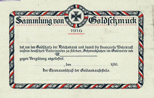 'Am Vormittag befaßte sich im Stadtverordnetensitzungssaale einer Versammlung unter dem Vorsitze des Oberbürgermeisters mit der Schaffung einer Goldankaufsstelle […]. Ein Aufruf wendet sich an die Mitbürger und Mitbürgerinnen in Stadt und Land, Goldgegenstände aller Art, Schmuck und Münzen, auch Edelsteine im Interesse der Stärkung des Goldbestandes unserer Reichsbank zur Goldankaufsstelle im Rathause zu bringen. Dem Einlieferer wird zur bleibenden Erinnerung an die große Zeit ein Gedenkblatt ausgehändigt.'