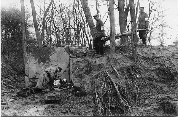 'Die freiwillige Sanitätskolonne vom Roten Kreuz betonte in ihrer Hauptversammlung, daß der Magistrat ihr ein geeignetes Übungslokal in der Josephsturnhalle zur Verfügung gestellt habe. Beim Jahresbericht wurde ausgeführt, daß die Kolonne 40 aktive und 8 inaktive Mitglieder zähle. Um den Bedarf an Krankenträgern und Pflegern zu decken, wurden sofort nach der Mobilmachung zwei Lehrgänge abgehalten, an denen insgesamt 87 Herren teilnahmen, die sich aber später nicht alle an der Tätigkeit der Kolonne beteiligten. Die erste Maßnahme bestand darin, auf dem Hauptbahnhof eine ständige Wache einzurichten, die einzeln ankommenden und durchreisenden Verwundeten Hilfe zu leisten hat. Die Wache ist Tag und Nacht in der Regel mit zwei Mann besetzt. Des weiteren ist es Aufgabe der Kolonne, bei Ankunft von Verwundetentransporten und Lazarettzügen die Kranken auszuladen bzw. den militärischen Hilfsmannschaften die erforderlichen Anweisungen zu geben und von hier aus weitergehende Transporte nach auswärtigen Lazaretten zu begleiten.'