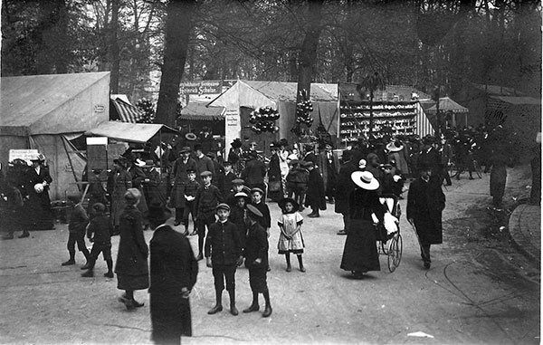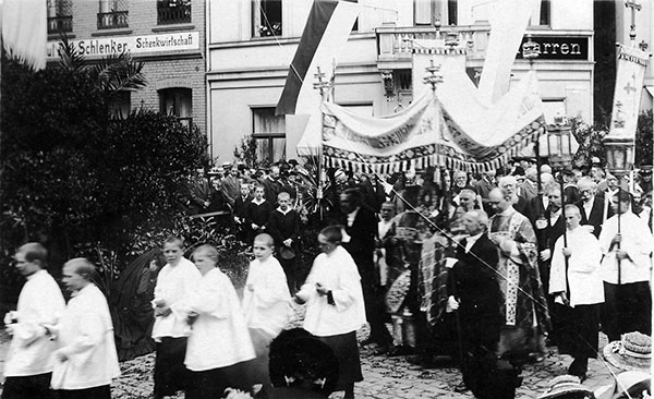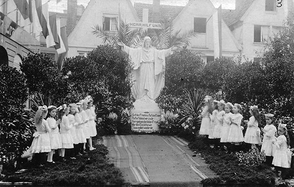 'Unter starker Beteiligung der Bürgerschaft fand die Große Prozession statt. Hinter Magistrat und Stadtverordneten schritten etwa 400 Verwundete aus den hiesigen Lazaretten. Wie im Vorjahre waren an der Clemenskirche und auf dem Platz beim Kiepenkerl-Denkmal auf den Krieg bezügliche Gruppen aufgestellt; hier thronte inmitten von Blattpflanzen und Blumen eine Christusfigur; dreißig Engelchen trugen folgende, die Wünsche der ganzen Welt enthaltende Bittschrift die Stufen empor:
