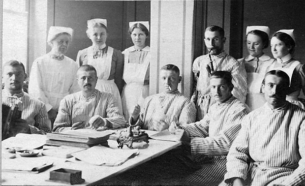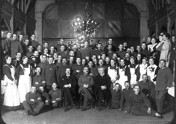 'Für die Verwundeten in den hiesigen Lazaretten veranstaltete der Ortsverein vom Roten Kreuz mit gutem Erfolge eine Sammlung von Wein. Auch 2.000 Mark aus einem Wohltätigkeitskonzert wurden diesem Zweck zur Verfügung gestellt. Ein zweites Konzert und eine Sammlung fanden außerdem für die 'Deutsche Volksspende zum Ankauf von Lesestoff für Heer und Marine' statt.'