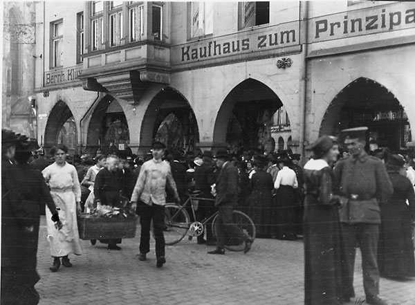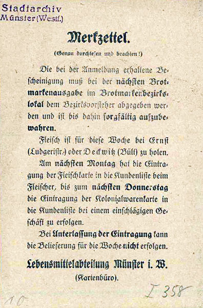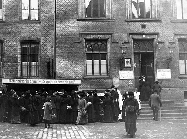 'Die allwöchentlich sich vergrößernden 'Polonäsen' und Drängereien der Käufer veranlaßten die Honigkuchenbäckerei Ewers, ihren Verkaufsladen an der Herrenstraße zu schließen und ihre schönen, begehrten, noch dazu brotmarkenfreien Honigkuchen durch eine Anzahl anderer Geschäfte verkaufen zu lassen. Wie groß die Lebensmittelnot ist, konnte man in diesen Tagen auch vor dem Schokoladengeschäft Reichardt-Kakao am Prinzipalmarkt sehen: die Ausgabe von etwas Schokolade führte zu gefährlichem Ansturm, wüstem Gedränge und stundenlangem Warten zahlreicher Kauflustiger.'