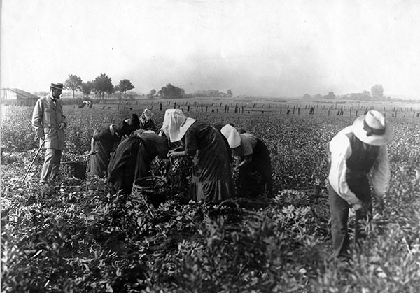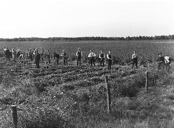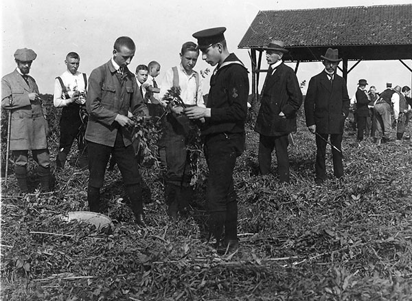 'Als 'Hilfsmannen für die Landwirtschaft' enteten vierzig Schüler des Städtischen Gymnasiums und Realgymnasiums auf dem Gute des Landwirts Herold in Amelsbüren Erbsen für die Stadt Münster ab. Aus der Massenspeise-Küche Schrage wurde ihnen die Mittagskost (60 Liter Massenspeise) zugefahren.'