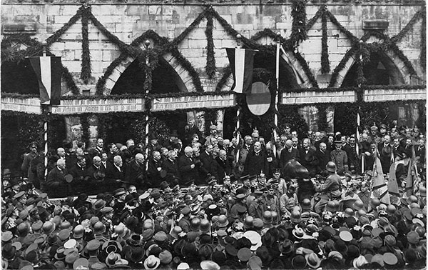 'Wochenlang erwartet, tagelang vorbereitet, gestaltete sich der Empfang des Infanterie-Regiments Nr. 13 zu einer gewaltigen, unvergeßlichen, denkwürdigen Feier. Wie immer war auch an diesem Tage der Prinzipalmarkt das pulsende Herz der ganzen Stadt und der Freiluftfestsaal der ganzen, bitterschönen Feier. Vom Gipfel des Rathauses hing das große Banner herunter über die Tannengirlanden der Bogenhalle und über die fahnengeschmückten, begrünten Masten der vor ihr aufgeschlagenen Tribüne. Haus für Haus im Flaggenschmuck alter, wohlvertrauter Farben. Zwischen dem Sentenzbogen und Coppenraths Ecke hing eine Girlande an zwei großen Masten und in ihrer Mitte ein Schild mit einem Reimgeschmiede von Maria Findeklee: Willkommen in der Heimat wieder / nach wilden Kämpfen, Not und Qual, / ihr unbesiegten Heldenbrüder, / wir grüßen Euch vieltausendmal. / Für uns habt blutend Ihr gerungen, / gezahlt den Feinden nach Gebühr. / Der Heimat Schutz ist Euch gelungen. / Nehmt heißen Herzensdank dafür!'