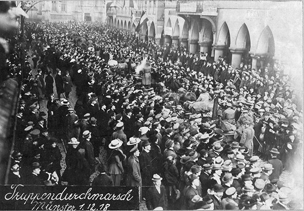 'Unter jubelnden Zurufen, Tücherschwenken und Hütewinken zog am Nachmittag um 4 Uhr mit Musik, Gesang und wehenden Fahnen in den sächsischen Landesfarben das Schützenregiment Nr. 108 über den Prinzipalmarkt als erster größerer Truppenteil, der auf dem Marsche zur Demobilmachung Münster berührte.'