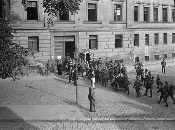'Münster bietet das Bild einer Stadt vor dem Sturm. Auf allen Straßen ziehen militärische Sicherheitsabteilungen in Helm mit Gewehr durch die Stadt, zu vieren oder zu achten, unter Führung von Feldwebeln, Unteroffizieren oder Sergeanten. Von den Mauern mahnen Plakate des Oberbürgermeisters. Viele Leute halten sich aus Furcht vor Zusammenstößen zu Hause. Die Straßen sind fast leer. Der sonst so belebte Prinzipalmarkt ist wie ausgestorben. Auf allen lastet der Druck der militärischen Katastrophe, die Wucht der Hiobsposten aus dem Reich und die Ungewißheit der Stunde.'