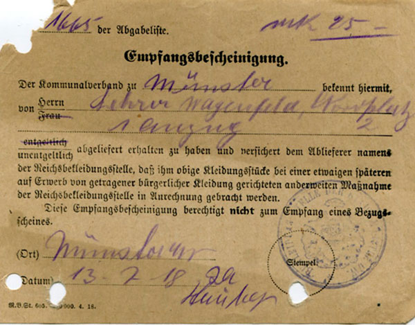 'Für Liebesgaben an die jetzt und später aus Feindesland zurückkehrenden Kriegsgefangenen und Internierten bewilligte die Stadtverordneten-Versammlung 6.850 Mark aus dem Kriegsfonds. Mit Rücksicht auf die erhebliche Inanspruchnahme der Bürgerschaft durch die zahlreichen Sammlungen zu anderen wohltätigen Zwecken hatte der Magistrat von einer öffentlichen Sammlung abgesehen.'