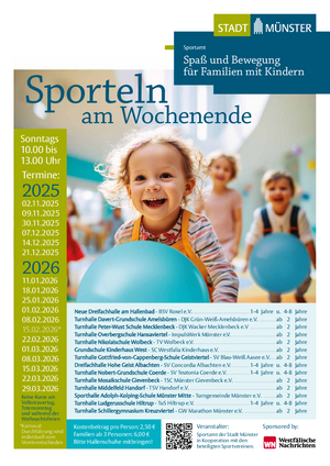 „Sporteln am Wochenende“ findet immer sonntags von 10 bis 13 Uhr statt. Am 16. November (Volkstrauertag) und 23. November (Totensonntag) sowie vom 22. Dezember bis 6. Januar (Weihnachtsferien) fällt das Sporteln aus.